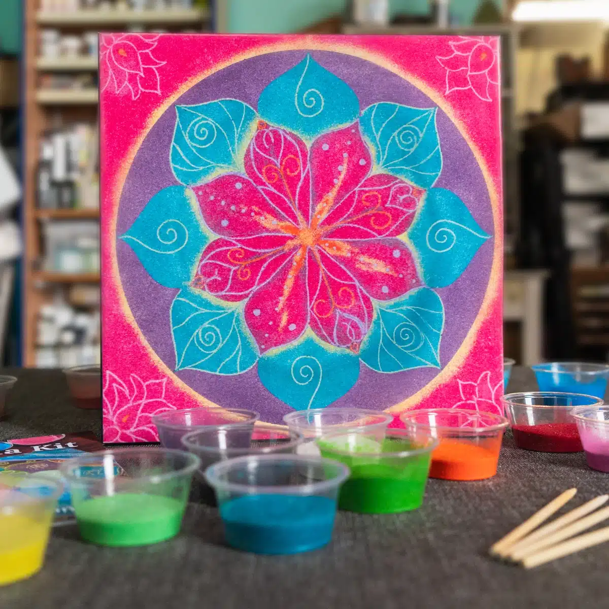 The Personal Sand Mandala Kit is a tactile, relaxing art experience. It reduce stress, aids mindfulness, and helps combat isolation through a shared experience. There’s no pressure to “get it right” or to have a particular outcome.